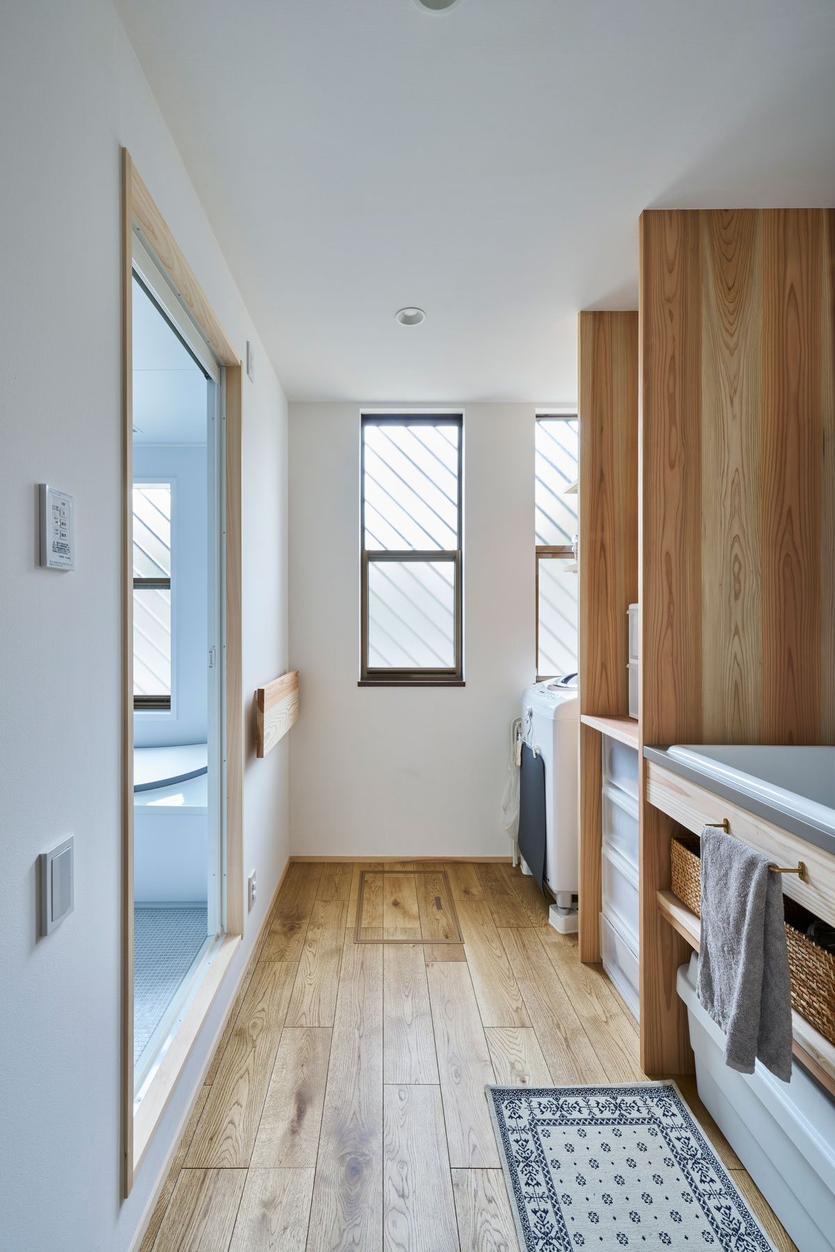 「広くてのびのびしたバスルームは僕のこだわりです。うちは毎日家族みんなでお風呂に入るんですが、以前のバスタブだと4人ではかなり手狭で。広さは絶対に譲りたくないと相談したら、もともと洗面室の隣にあったトイレを階段下へ移動し、そのスペースを使ってバスルームとリネンルームを広くしてもらえたんです」と、ご主人。