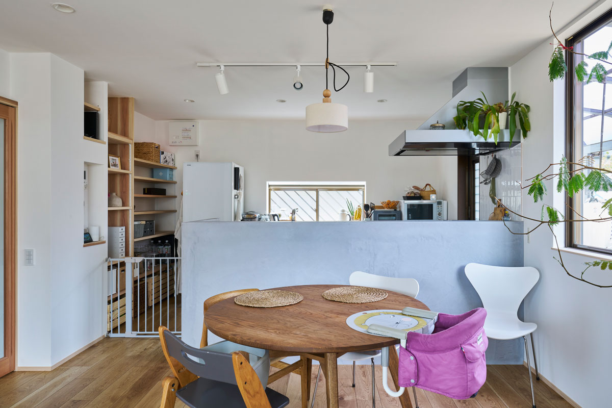 「自分たちのこだわりを優先してもらったところもあれば、kinotoの提案をそのまま取り入れたところもたくさんあります。例えば、リビングの壁。予算を抑えるために最初は接着剤で希望の壁紙を貼り付けてもらう予定でしたが、"息子さんのアレルギーが心配なら、ここは絶対にこだわった方がいいです!"と言われて自然素材の塗り壁にしてもらいました」と、奥さま。
